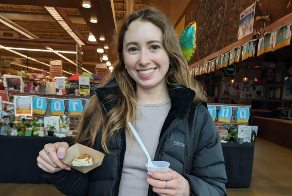 Healthy samples are found throughout the store like Quaker Rice Cakes topped with almond butter and banana slices.